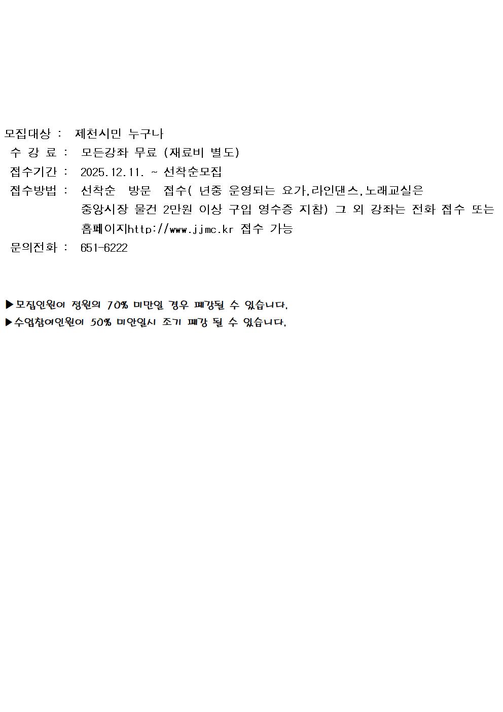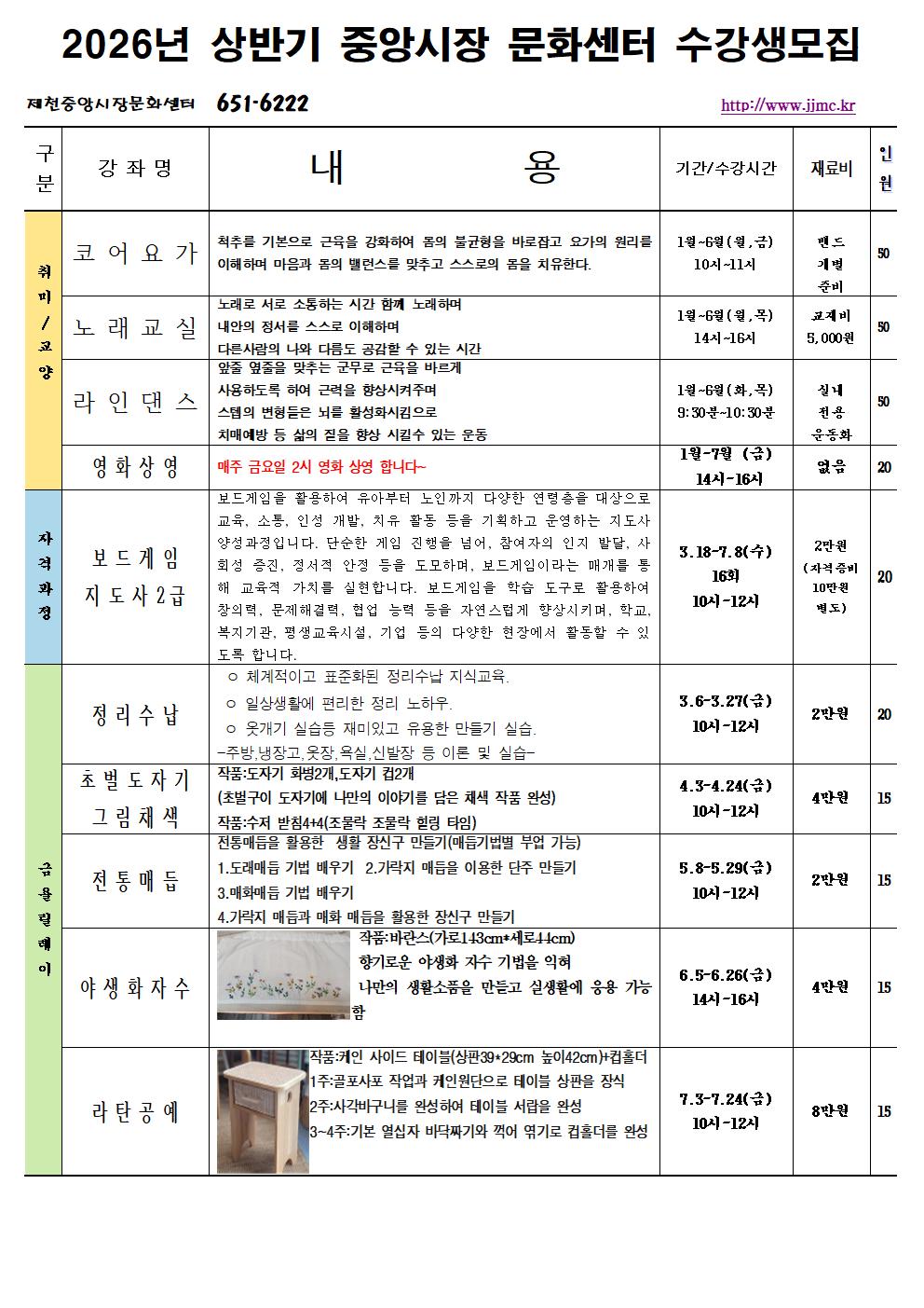 2026상반기 수강생 모집 안내 페이지 정보 작성자 운영자 댓글 0건 조회 75회 작성일 26-01-28 16:27 본문 목록 다음글중앙시장 정기 휴일 안내 25.08.01 댓글목록 댓글목록 등록된 댓글이 없습니다.
